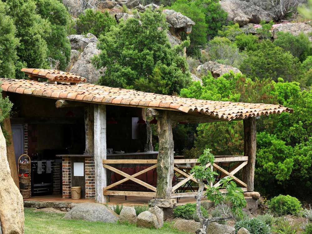 Im Außenbereich befindet sich eine Sommerküche (von Frühjahr bis Herbst) mit Grill, Gasherd, Backofen, Gefrierschrank, Geschirrspüler, Kaffeemaschine, Essbereich, Schwimmbad (von April bis Oktober beheizt), Sommerlounge und Waschküche.
